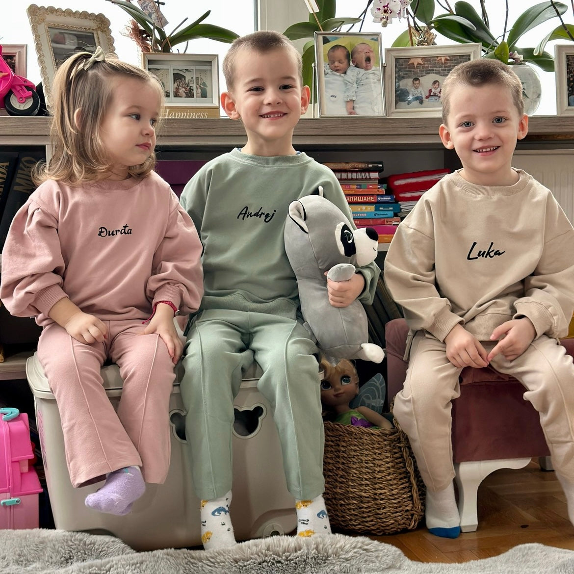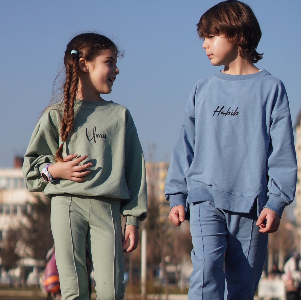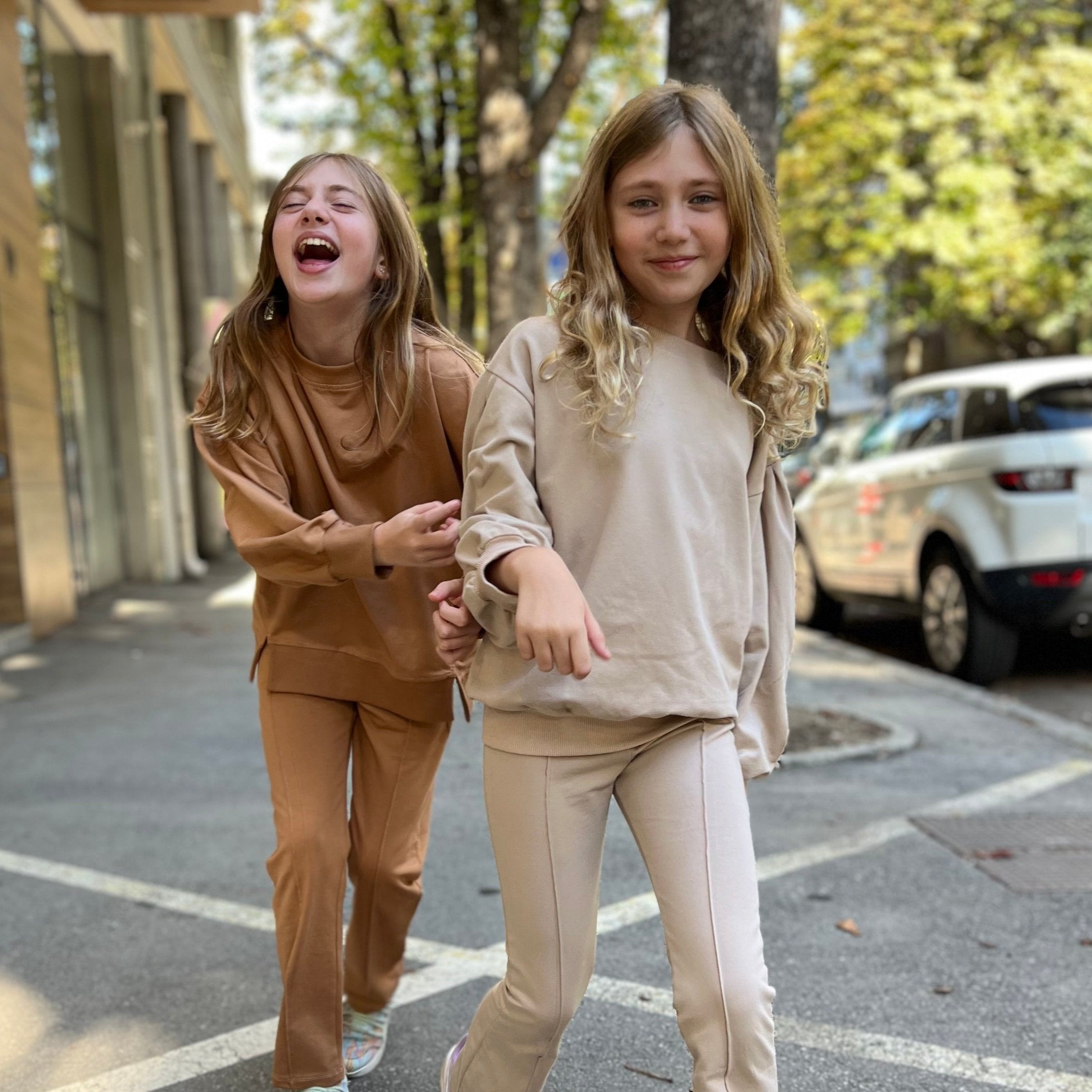 В комплект входит суперудобный верх-толстовка с рукавами-буфами и низ с расклешенными брюками.
